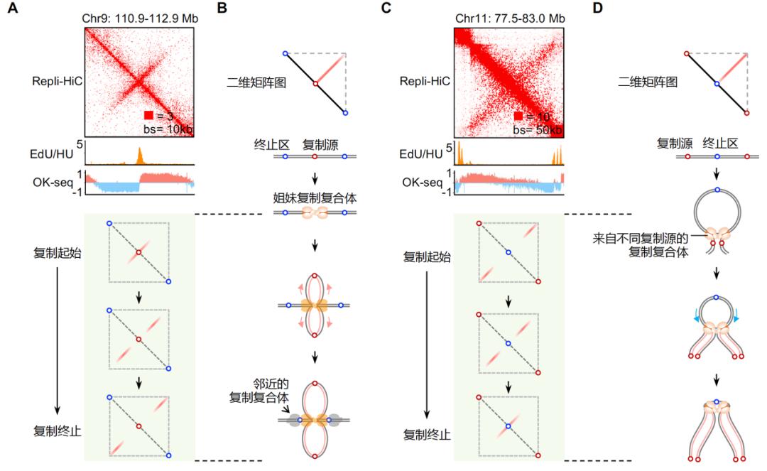该研究建立了首个检测DNA复制叉附近染色质相互作用的方法,并发现在人类和小鼠细胞的DNA复制过程中,复制叉并非传统模型中认为的独立反方向前进,而是彼此之间能够以偶联的形式持续相互作用,协同完成整个复制延伸过程,并指导复制终止。