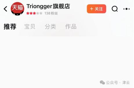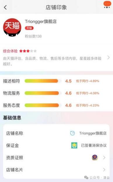 3月13日,津云记者点进了天猫“Triongger旗舰店”,该店铺工商资质页显示,企业名称为“杭州朴琪商贸有限公司”,成立时间为2023年4月10日,注册资本为10万元。目前该售假店铺并无任何异常,店内没有任何商品,看不出曾经有过售假行为,但店铺的商品描述、卖家服务、物流服务等评分,均被打上了“低”的标志。
