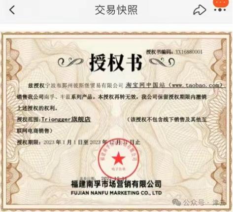 “授权书”写明“兹授权宁波市鄞州彼斯堡贸易有限公司淘宝网中国站销售我公司南孚、丰兰系列产品。”,授权范围是“Triongger旗舰店”,授权时间为2023年1月1日至12月31日。