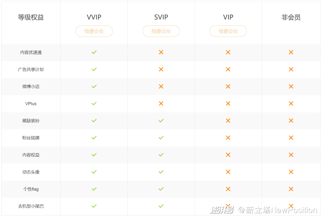 增值服务的调整迎合了这一逻辑。2023 年下半年,微博在原有的 VIP/SVIP 体系外,新增 VVIP 体系,将微博小店、广告共享计划、VPlus 会员等功能整合入内。微博的三种会员里,VIP 对应普通会员、SVIP 对应社交会员、VVIP 对应创作者经营会员。如名字所示,VVIP 的独占功能都与创作者变现相关,比如“内容优速通”,可保证争议内容快速审查,实现更快速的涨粉和创收。