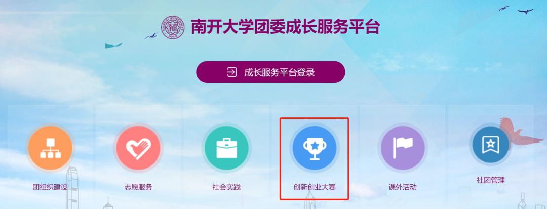 1-使用校园网打开网址南开大学团委成长服务平台(czfw.nankai.edu.cn),选择“创新创业大赛”。