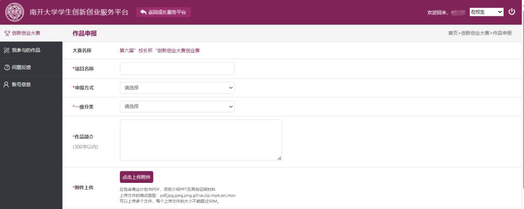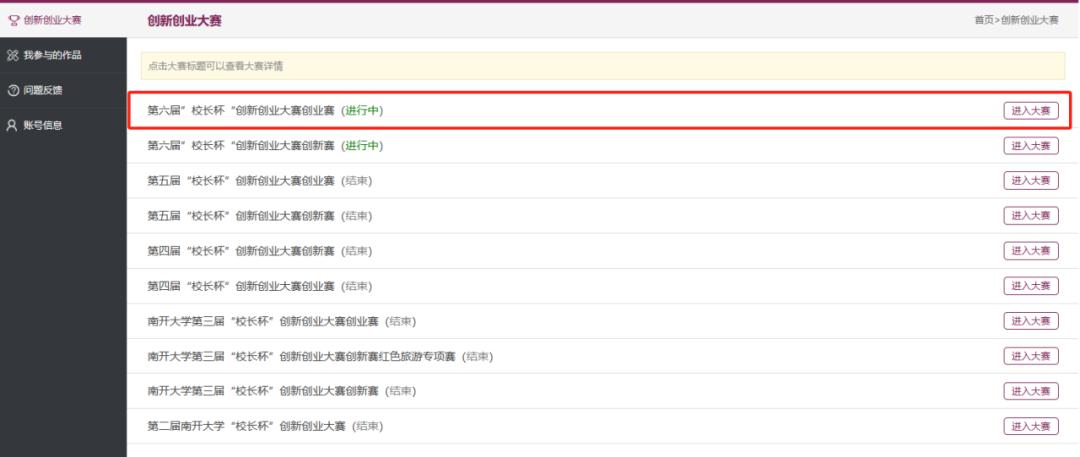 点击:南开大学第六届“校长杯”创新创业大赛创业赛“进入大赛”按钮,浏览大赛通知后,点击右上角“报名”,进入作品申报页面。