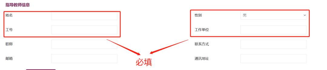 指导教师信息部分,相关老师的姓名、工号、性别与工作单位为必填项,否则指导老师将无法审核~填报前一定要和老师确认后再填写哦~~有多位指导教师需排序填写~