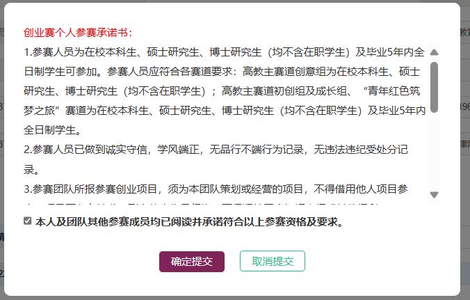 tip2.点击“提交”后,请申报人及团队成员仔细阅读提示框并签署如图所示承诺书,再点“确定提交”后,项目就申报完成啦!