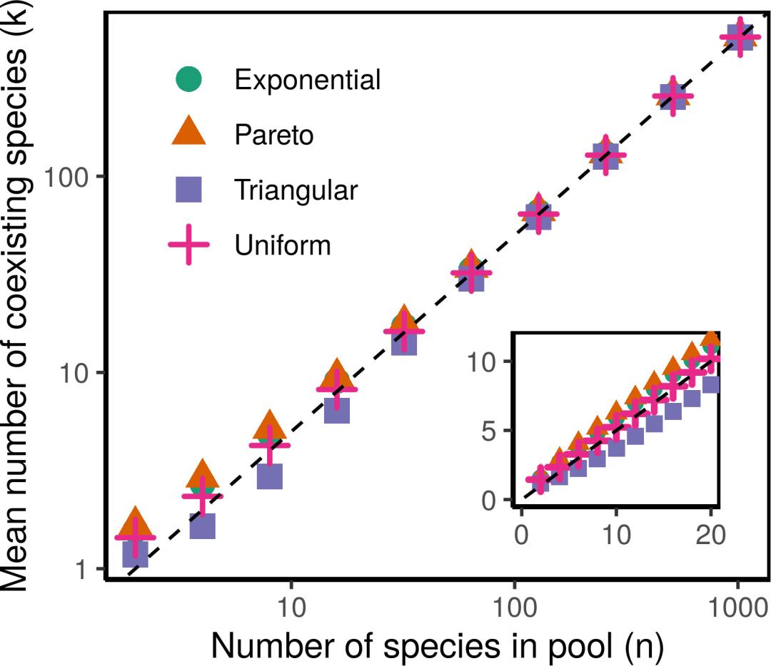 该研究发现在一个大型物种池中,几乎正好一半的物种通常会共存,即使随着物种池的规模增长,也没有饱和状态,并且这与特征的基础分布关系不大。通过分析结果和模拟的结合,该研究表明这种无限的生态位包装 (niche packing) 是因为组装活跃地将群落移向生态位空间中的过度离散配置。该发现也适用于一个现实的组装场景,即物种依次从固定的区域池中入侵。当多样性在元群落中自发产生时,物种丰富度仍然无限增长,但增长速度较慢。综上,该研究结果表明,即使整个物种池的共存极不可能,竞争-殖民权衡仍然可以支持多样化群落的出现。