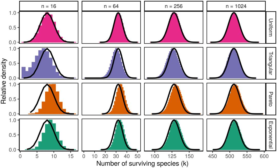 图3 来自随机种群的存活的物种数量的分布S。对于大的n,不管种群中的迁移率如何分布,S几乎可以被二项分布(黑色曲线)很好地逼近。