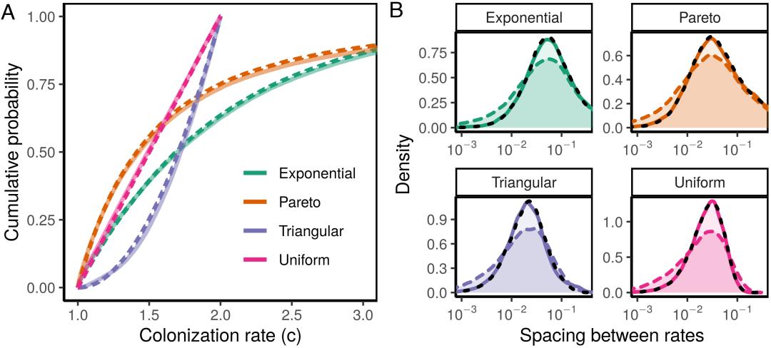 图4 比较组装的元群落与随机池中迁移率分布。(A) 组装的元群落中迁移率的边际分布(实线)与池中的分布(虚线)非常接近。(B) 连续迁移率之间的间距分布对于组装的元群落(实线)比起从相应池中随机选择的大小相同的物种集合(彩色虚线)更为突出。特别地,与从池中随机抽样相比,组装的元群落不太可能有非常小的间距。相反,实际的间距与池中每两个物种之间的间距分布非常相似(黑色虚线)。