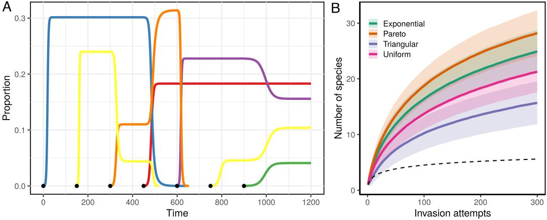 图5 两种不同的逐个组装场景。(A) 当物种从固定的池中逐个入侵时,元群落最终会收敛到与同时引入所有物种时相同的不可入侵均衡状态。(B) 在全新入侵情景中物种丰富度的累积。彩色线条显示了与入侵尝试次数相关的共存物种平均数量。阴影表示标准偏差。平均多样性的积累速度高于对数下界(虚线)。