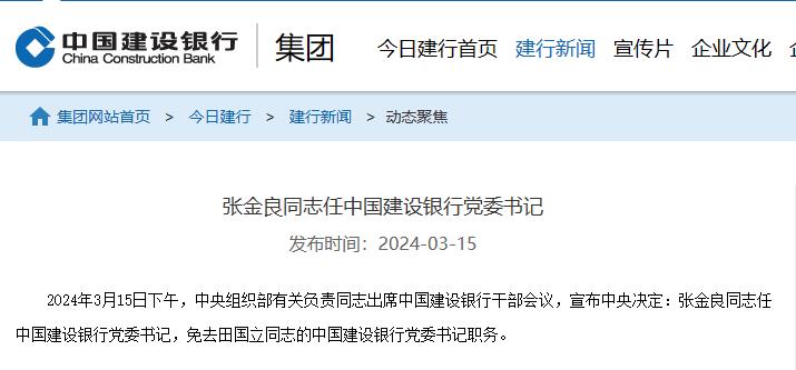 据建行官方消息,2024年3月15日下午,中央组织部有关负责同志出席中国建设银行干部会议,宣布中央决定:张金良同志任中国建设银行党委书记,免去田国立同志的中国建设银行党委书记职务。