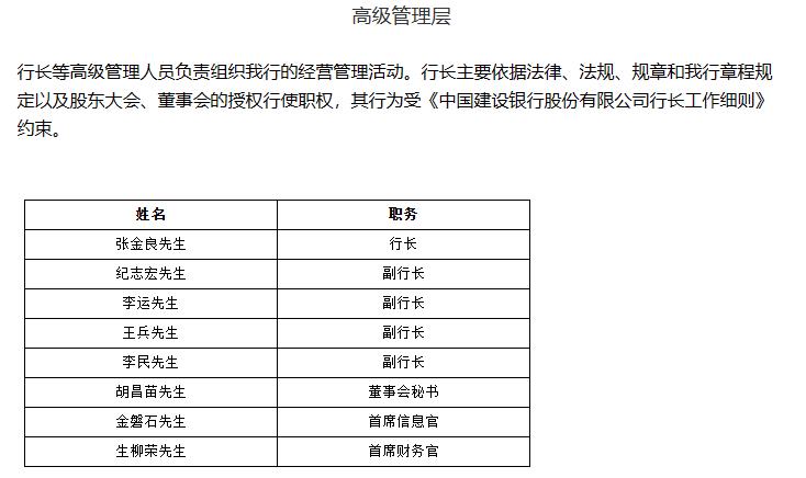 今年1月,建行副行长崔勇因工作调动辞任。目前,建设银行的高级管理层呈“一正四副”的格局,分别是:行长张金良,副行长纪志宏、李运、王兵、李民。另外,董事会秘书胡昌苗、首席信息官金磐石、首席财务官生柳荣三人,也在高管名单之内。在张金良此次被提拔使用后,建行行长的职务也将虚位以待。