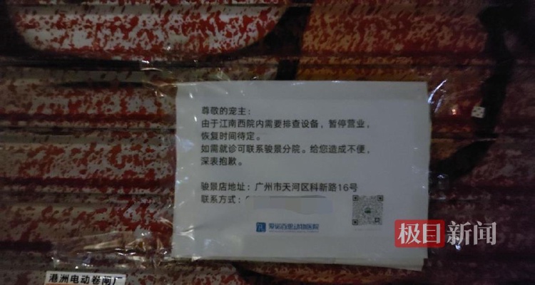 涉事动物医院位于广州市海珠区江南东路。事故发生的2月20日下午,极目新闻记者前往探访时看到,该院大门紧闭,门上张贴告示称院内需排查设备,暂停营业。3月14日夜,记者回访门店看到,其仍在停业中。