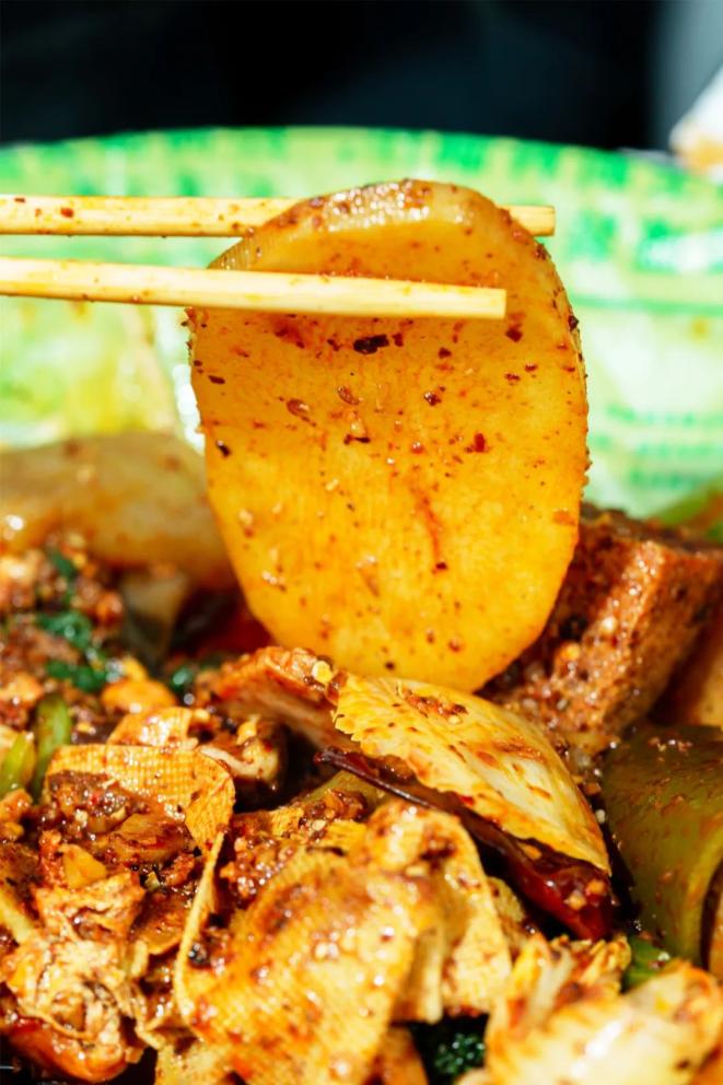 洋芋简单切成片,也不乏花式做法——兰州的马三洋芋片,以薄薄脆脆的口感,和诱人的红油辣椒取胜;紧邻兰州的临夏,东乡洋芋片则是厚土豆片,加上青红椒与洋葱齐炒,再调入特制料汁,软糯与焦香并存,十分下饭。