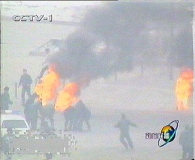 ▲2001年天安门广场自焚事件现场视频截图《周处除三害》影片的高潮,当属陈桂林“血洗礼堂”的场景。重新“杀回来”的陈桂林当众拆穿“尊者”的阴谋并将其“爆头”,本以为邪教组织会树倒猢狲散,没想到却发生了更为荒诞的一幕:林禄和的情妇竟然接过了“尊者”的“衣钵”,在尸体面前带领信徒继续高唱“圣歌”,妄图继续欺世盗名。
