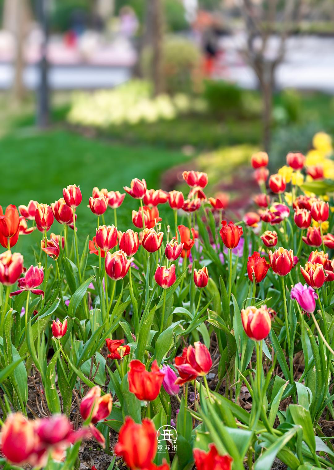 在苏州公园,一片郁金香花海引得不少路人放慢或停下脚步。花坛映入眼帘,红的、黄的、粉的,宛如调色盘上的颜料点缀在花坛里。各种颜色的郁金香争奇斗艳,散发出阵阵清香,让人心旷神怡。