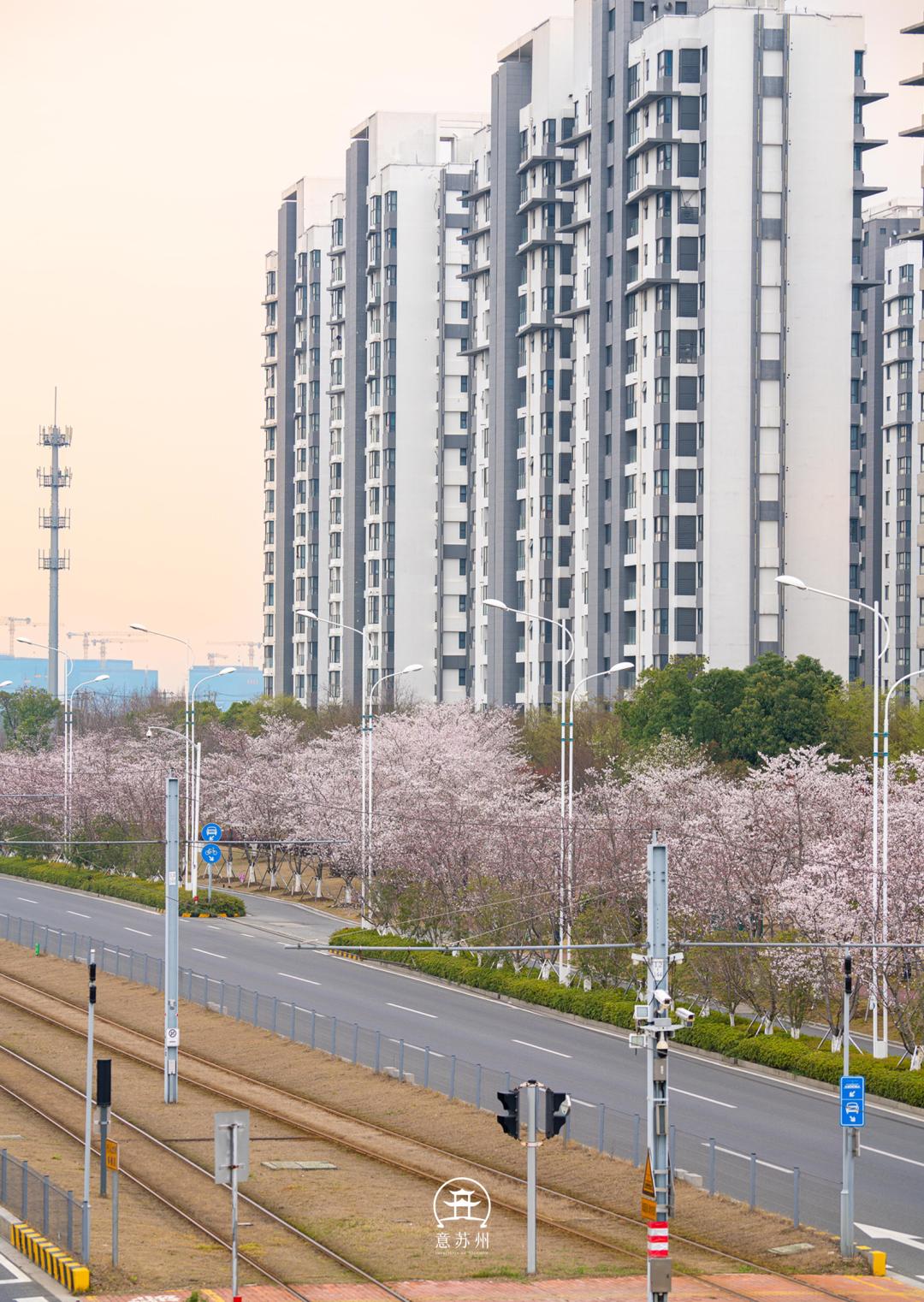 太湖大道路旁的百余株樱花也陆续抽出花苞,不少已经呈半开状态,从空中俯瞰,或深或浅的粉红色花朵,沿着马路次第绽放,好像一条条彩带。