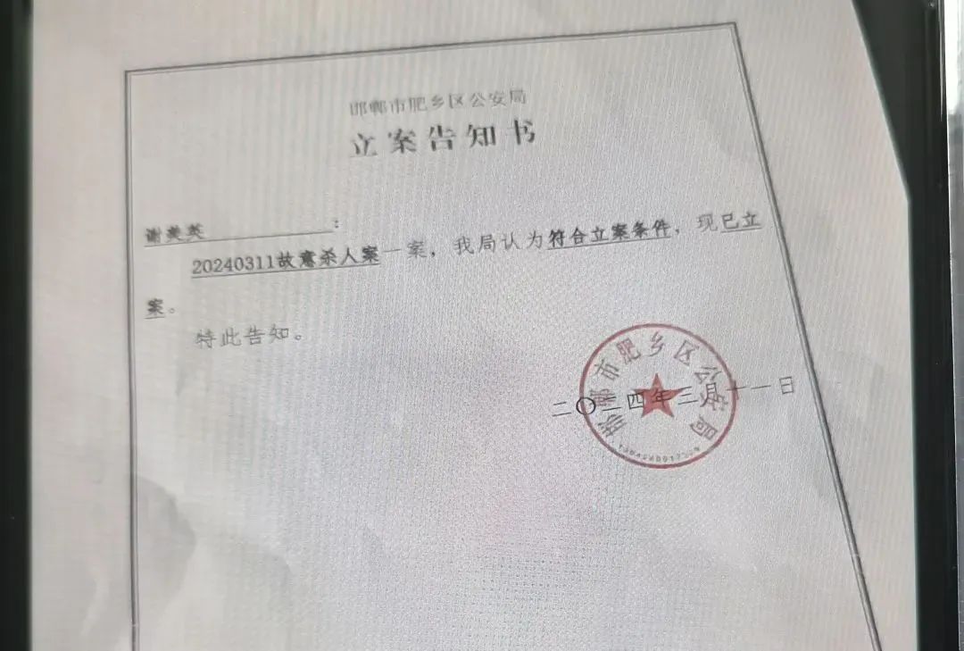 3月11日,王家收到了肥乡区公安局的立案告知书,案由是“故意杀人”。3月15日,记者从邯郸警方了解到,张某等三人因涉嫌故意杀人,已被刑事拘留,目前该案由邯郸市公安局刑侦支队、肥乡区公安局联合侦办,三人的行凶原因仍在调查中。