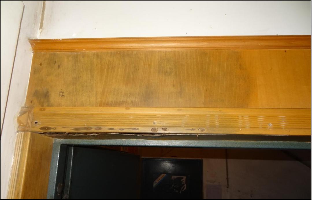 ▲门框上沿或墙缝有白蚁兵蚁在分飞孔聚集“听”——用螺丝刀等工具敲击白蚁可能危害的木柱、木梁、楼板、门窗框等部位,如能听到空洞的声音,有可能是白蚁危害蛀蚀过的部位。