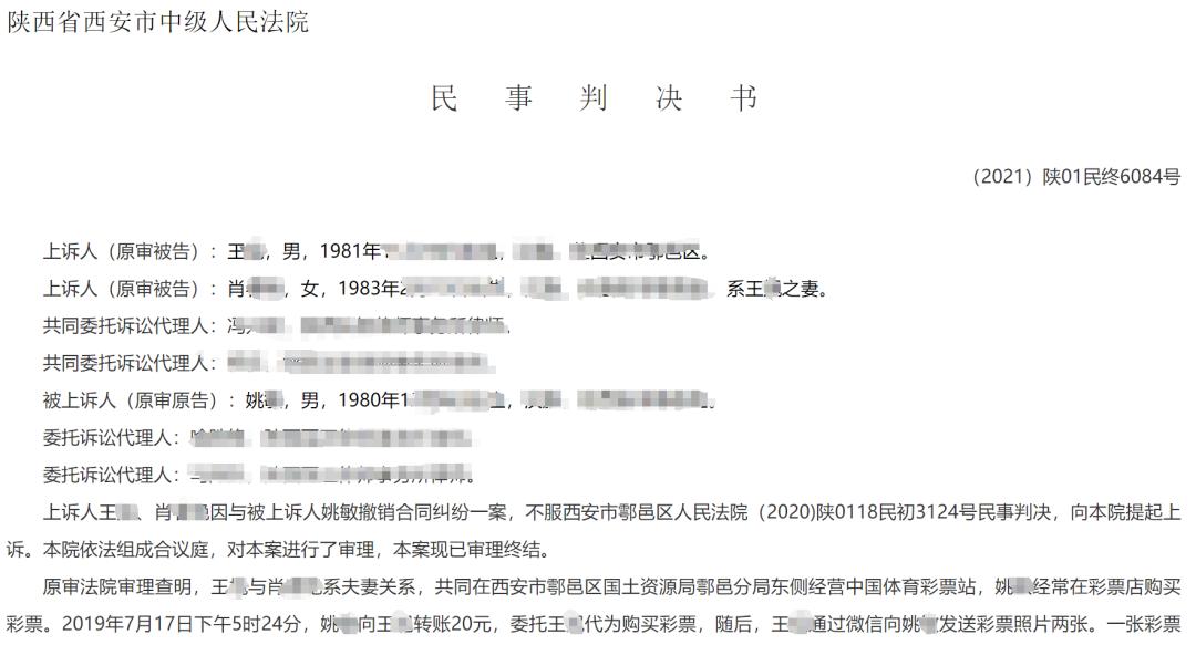 2019年9月4日,姚先生将王某夫妇诉至鄠邑区人民法院,请求法院判决确认中奖彩票的所有者为自己。陕西省体育彩票管理中心和高某,成为这起诉讼的第三人。经过反复拉扯,法院判定撤销双方此前所签署“协议”,中奖彩票归属姚先生所有。