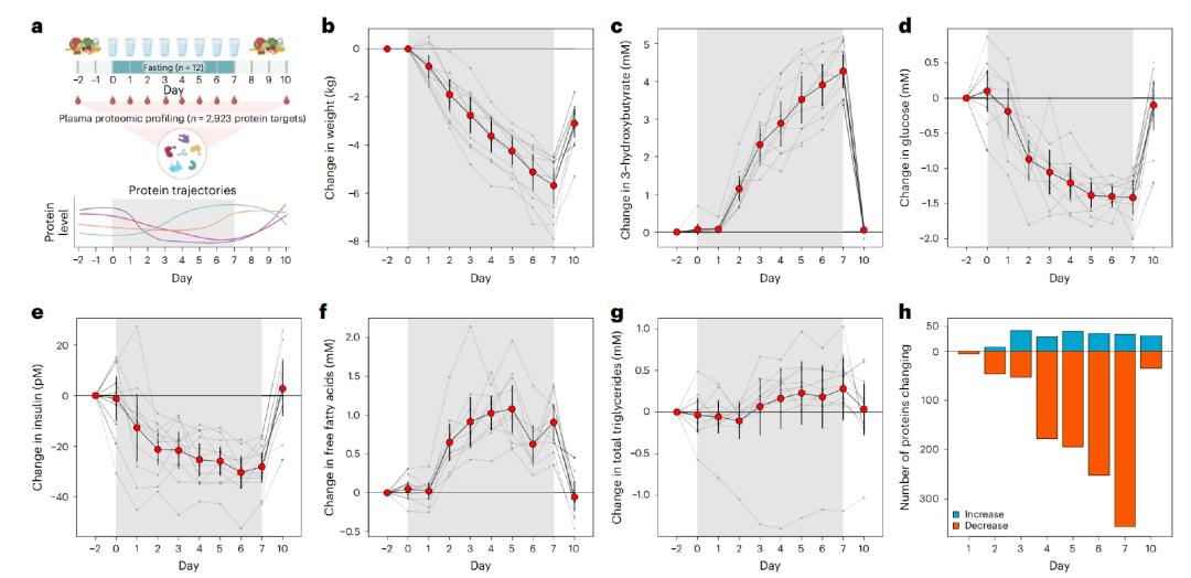 试验流程和基础信息变化在整个7天禁食期间,研究者还密切监视了参与者的健康数据——在禁食之前、期间和之后,研究者记录下血浆蛋白质组中约3000种蛋白水平的变化,探究禁食可能给健康带来的影响。