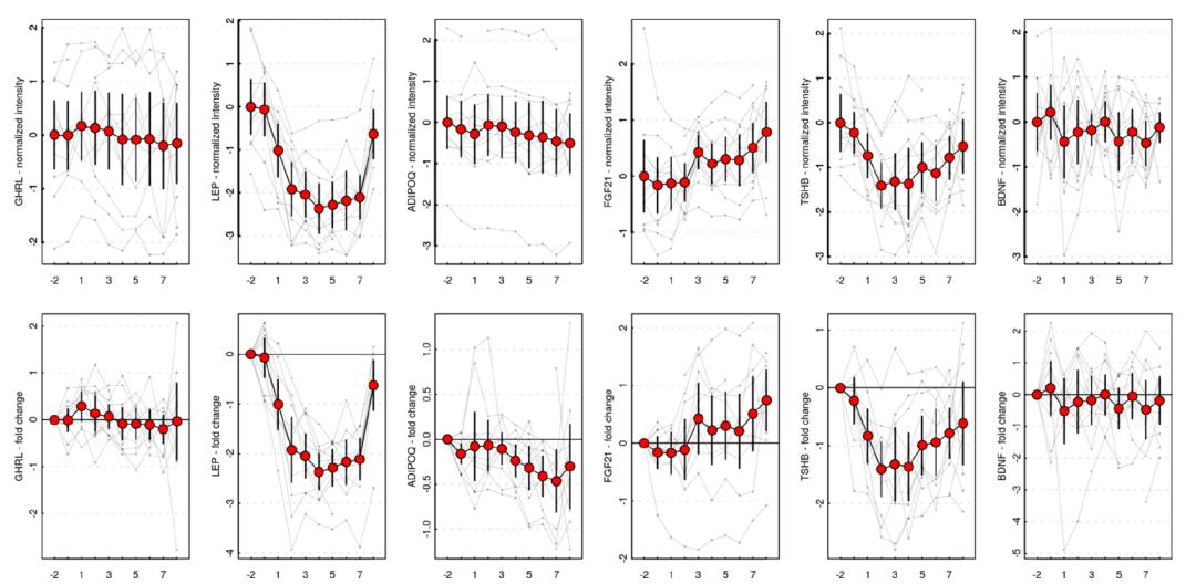 具体来说,这些改变的蛋白质靶标包括:血浆瘦素水平有所下降,在禁食的第四天降到最低点,约降低了2.39个标准差,而下丘脑-垂体-甲状腺轴也受到了抑制(即甲状腺素在第2天降至最低)。但其他进食/禁食相关的蛋白质却变化不大,比如:胃饥饿素、脂联素、脑源性神经营养因子仅出现了轻微的变化。