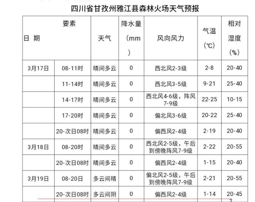 3月17日上午,四川省气象台发布雅江森林火情气象服务专报:预计未来三天,四川省甘孜州雅江县森林火场周边以晴间多云的天气为主,午后到傍晚风力可达4~6级,阵风7~9级,风向以西北风为主,雅江县森林火险气象等级4~5级(极高),林内可燃物易燃烧,火势易蔓延扩散,需注意局地较强阵风和风向突变对扑火工作的不利影响。