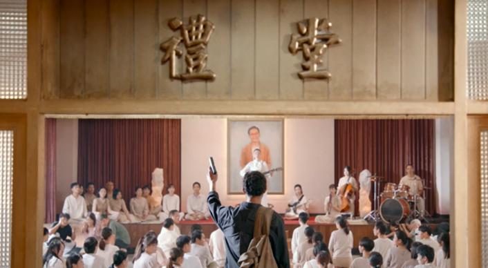 ▲《周处除三害》电影剧照庄严肃穆的大厅、巨幅画像的烘托、慈眉善目的外表……这些其实都是“尊者”为了自我神化的把戏。其实,现实的邪教主在伪装美化自身方面更加技高一筹。