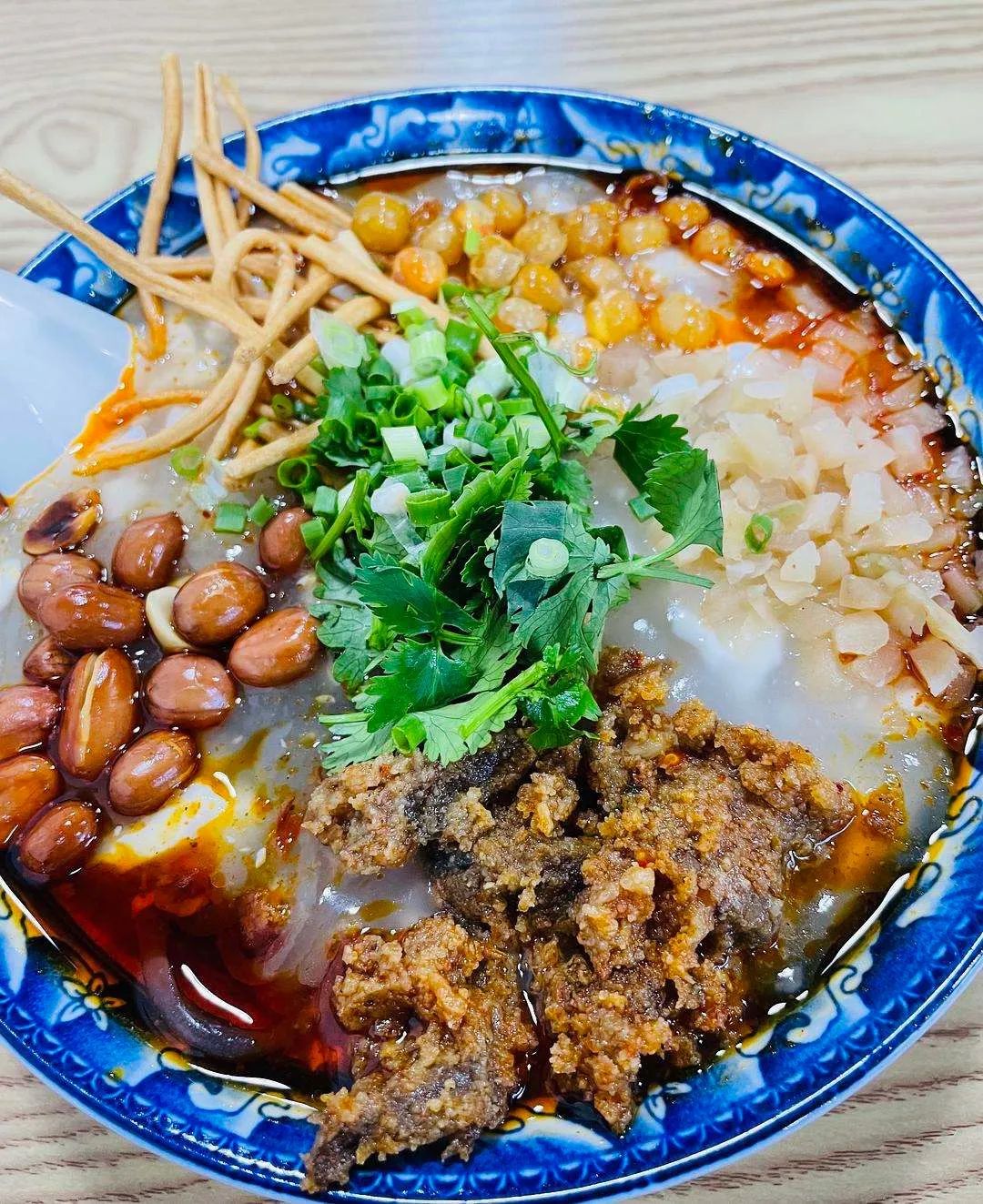 豆腐脑可荤、可素,可以选择不同的“浇头”,有粉蒸牛肉、肥肠、蛋冲等,当所有配菜放完,再浇上鲜红的熟油辣椒,吃起来特别爽口。