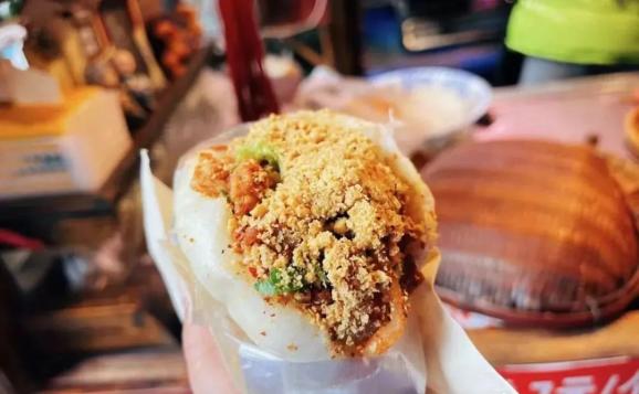 而真正的老饕,在吃豆腐脑的时候,还会再配上一块加了花生碎、牛肉等超多馅料的乐山汉堡:“咔饼”,这才算是大快朵颐一顿了。