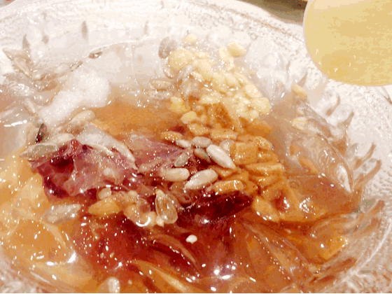 一份串妹冰粉,加入了西瓜、山楂、花生碎、 火龙果等多种水果和配料,简直就是冰粉中的“爱马仕”了。