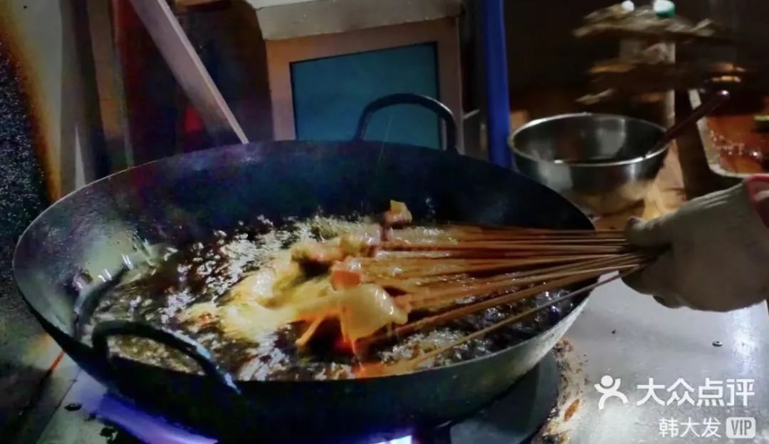 把竹签串起来的食材放入油锅中,开火的瞬间,那种炸裂声相当诱人,而经过猛火油炸后,各种肉类变得酥脆无比。