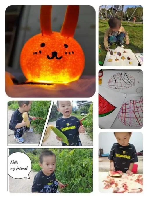 亲自体验。读到有关生活经验、体验活动的书籍,我们会尽量带领孩子参与社会实践,亲身体验。如制作桔子灯、农场采摘、捡树叶、切西瓜等等。