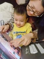 从孩子六七个月光景,我们就开始每天晚上一起亲子阅读十分钟。刚开始,他还不会讲话,我就抱着他,一幅图一幅图指给他看,一页书一页书讲给他听。有一天,他开始麻溜爬的时候,我发现他认真对着绘本咿咿呀呀的“讲话”。这是我第一次发现他开始自主阅读。我还发现小朋友居然会自己一页一页翻书,每翻一页都会低下头去认真观看,过一会儿再抬头翻下一页。似乎我平时跟他说的看书方法他都理解记住了。