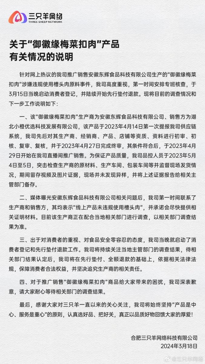 3月18日下午,主播“疯狂小杨哥”所属公司合肥三只羊网络科技有限公司针对“御徽缘梅菜扣肉”涉嫌违规使用槽头肉原料事件做出说明。