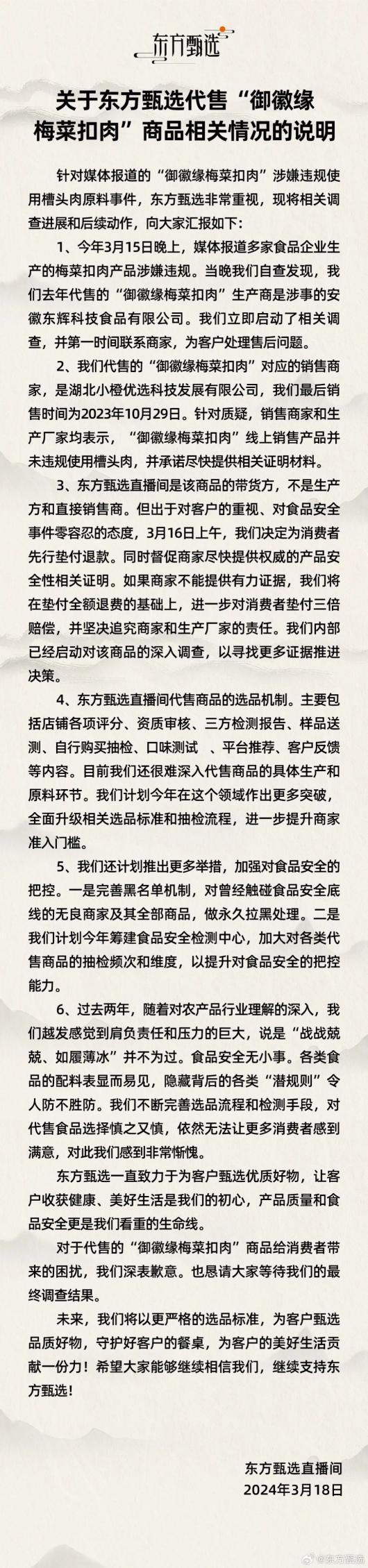18日上午,@东方甄选发布情况说明,称“对于代售的‘御徽缘梅菜扣肉’商品给消费者带来的困扰,我们深表歉意,并将先行垫付退款。