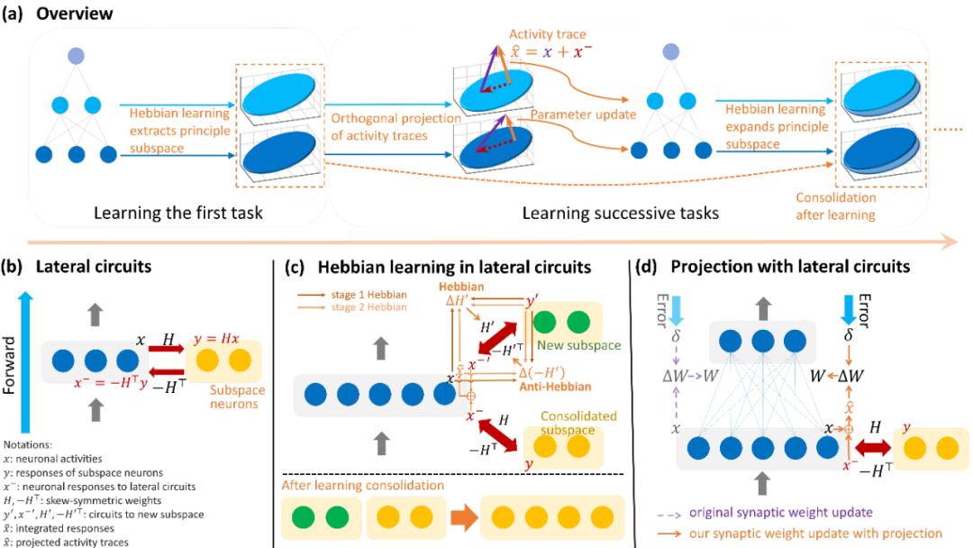 HLOP 方法基于神经形态的赫布学习和横向神经回路实现正交投影,如图 1 所示。方法的主要思想是通过横向神经回路中的赫布学习提取当前任务的神经活动的主子空间,从而使得横向连接在后续任务中能够进行正交投影以连续学习。因此与常规的前向网络不同,HLOP 考虑神经网络每一层将与一组子空间神经元有循环的横向连接,其不影响前向传播而主要调控用于权重更新的神经元的活动迹。