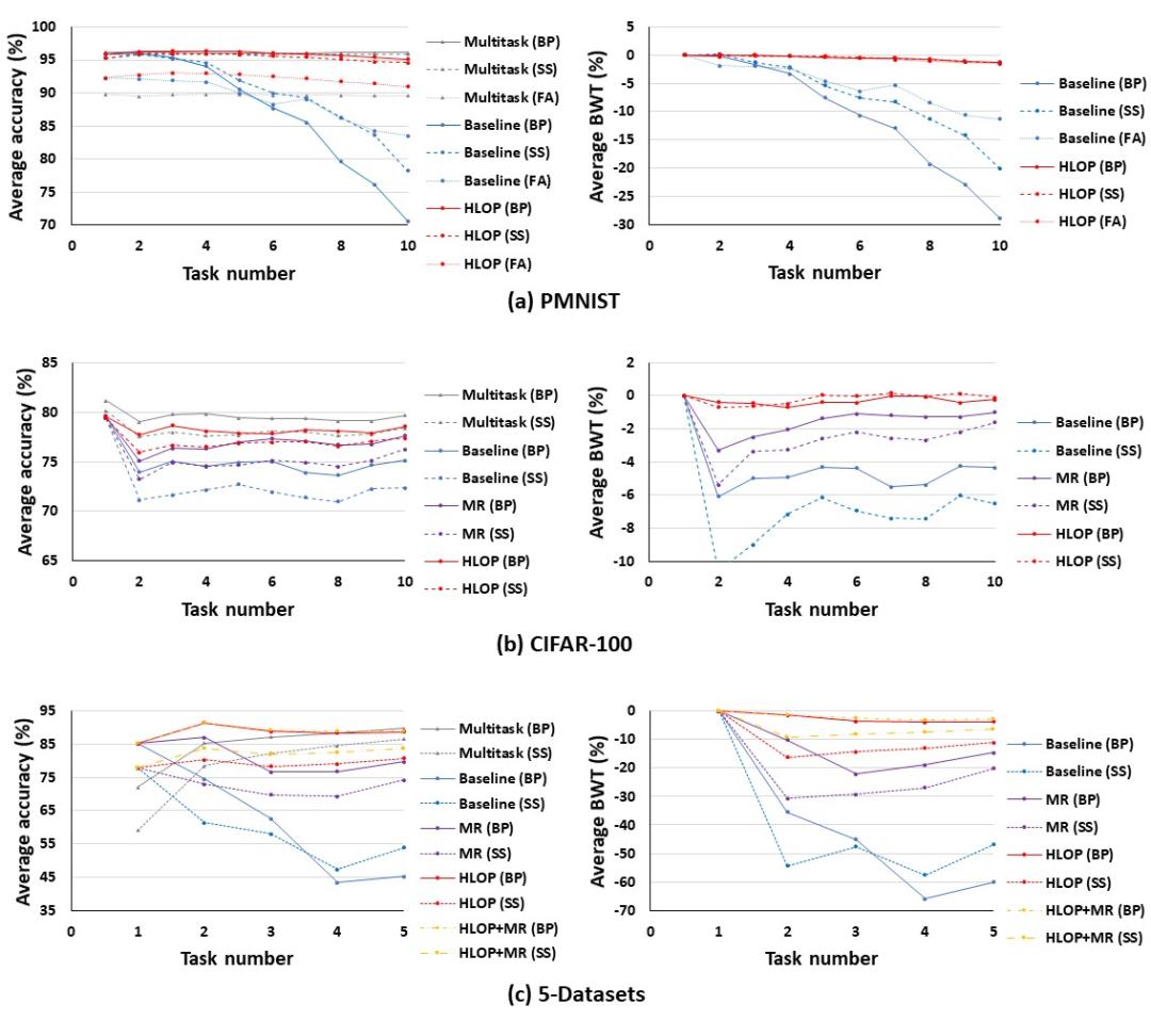 然后,HLOP 方法在任务增量和域增量的设定、不同数据集、不同网络结构、以及不同误差传播算法(反向传播及生物可行性更高的反馈对齐和符号对称方法)的设定下均一致地解决了灾难性遗忘,如下图所示。