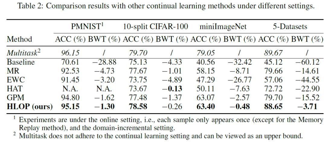 论文在多种设定的连续学习实验下验证了 HLOP 方法的有效性,考虑 ACC 和 BWT 两个指标,分别表示连续学习任务的平均正确率和旧任务的平均遗忘率。