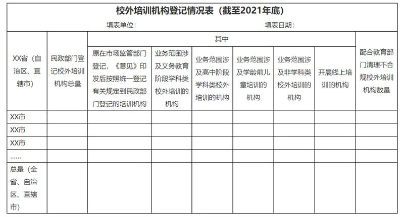 注:本表所称校外培训机构,是指中共中央办公厅、国务院办公厅《关于进一步减轻义务教育阶段学生作业负担和校外培训负担的意见》涉及的面向学龄前儿童、义务教育阶段学生、高中阶段学生的学科类和非学科类校外培训机构,不涉及职业培训机构以及面向成人的培训机构。