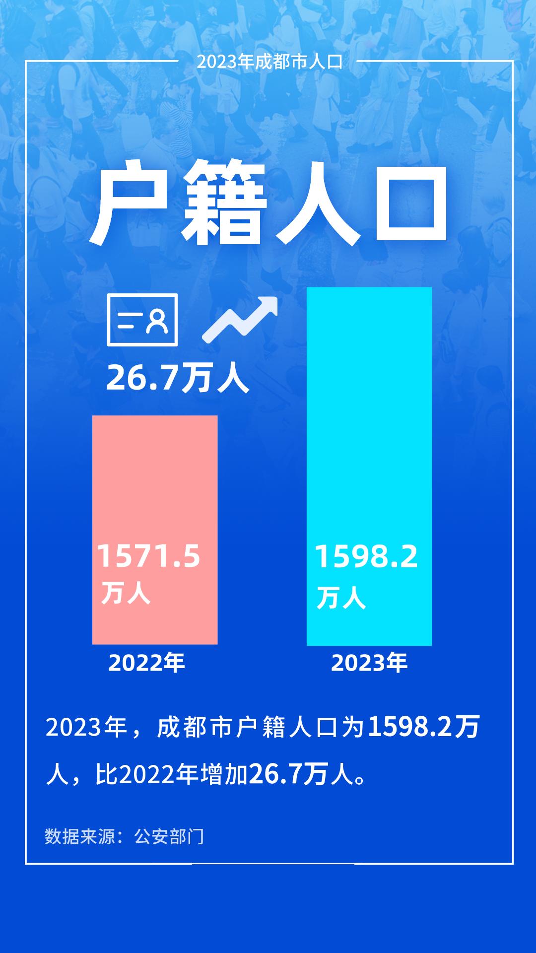 户籍人口2023年,成都市户籍人口为1598.2万人,比2022年增加26.7万人。