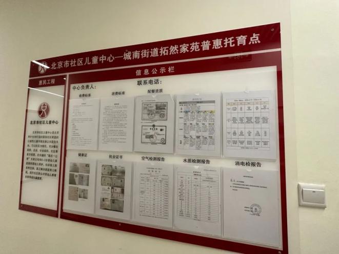 托育点外的信息公示。而这种嵌入社区的普惠托育点一定程度上打消了家长对安全、质量、监管等方面的担忧。吴娅介绍,今年,将在北京范围内推广这种模式。“下一步我们以这些试点作为“火种”,组织大家来学习、观摩、推广。各个街道找场地,这些场地基本上都是免费的,然后引入第三方机构,这样第三方机构拿到一个免费的场地,又离社区近,它免去了招生的成本、场地成本,对它来说轻资产的运行,没有太大的压力。”吴娅说。