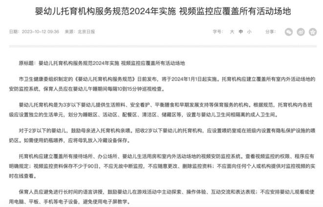 记者注意到,今年1月1日正式实施的北京市《婴幼儿托育机构服务规范》从制度要求、人员及配备、安全、卫生与健康四个方面提出要求。《规范》中明确提出了,托育机构应建立覆盖所有室内外活动场地的安防监控系统,保育人员应在婴幼儿午睡期间每隔10到15分钟巡视检查等内容。