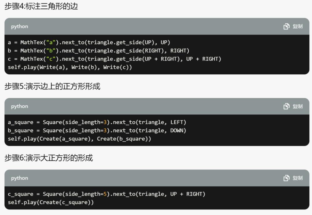来自@dr_cintas翻译过来,提示要求 Claude 3 使用 manim 代码创作一个有关勾股定理的小动画。同时还要求 Claude 3 把思考步骤也展示出来,并提供完整的代码。