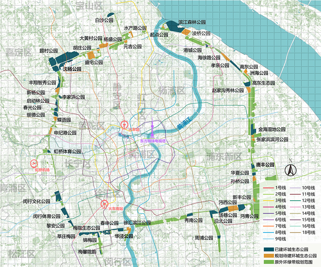 上海环城生态公园带是以外环绿带为骨架,向内连接10片楔形绿地,向外连接17条生态间隔带,联动“五个新城”环新城森林生态公园带形成的紧密联系的生态网络空间。