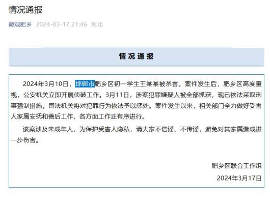 2024年3月10日,邯郸市肥乡区初一学生王某某被杀害。案件发生后,肥乡区高度重视,公安机关立即开展侦破工作。3月11日,涉案犯罪嫌疑人被全部抓获,现已依法采取刑事强制措施。司法机关将对犯罪行为依法予以惩处。案件发生以来,相关部门全力做好受害人家属安抚和善后工作,各方面工作正有序进行。