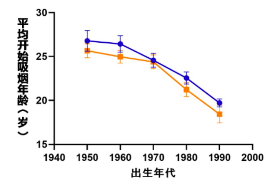 图.不同年代出生的女性吸第一支烟的平均年龄(蓝:城市地区,黄:农村地区)
