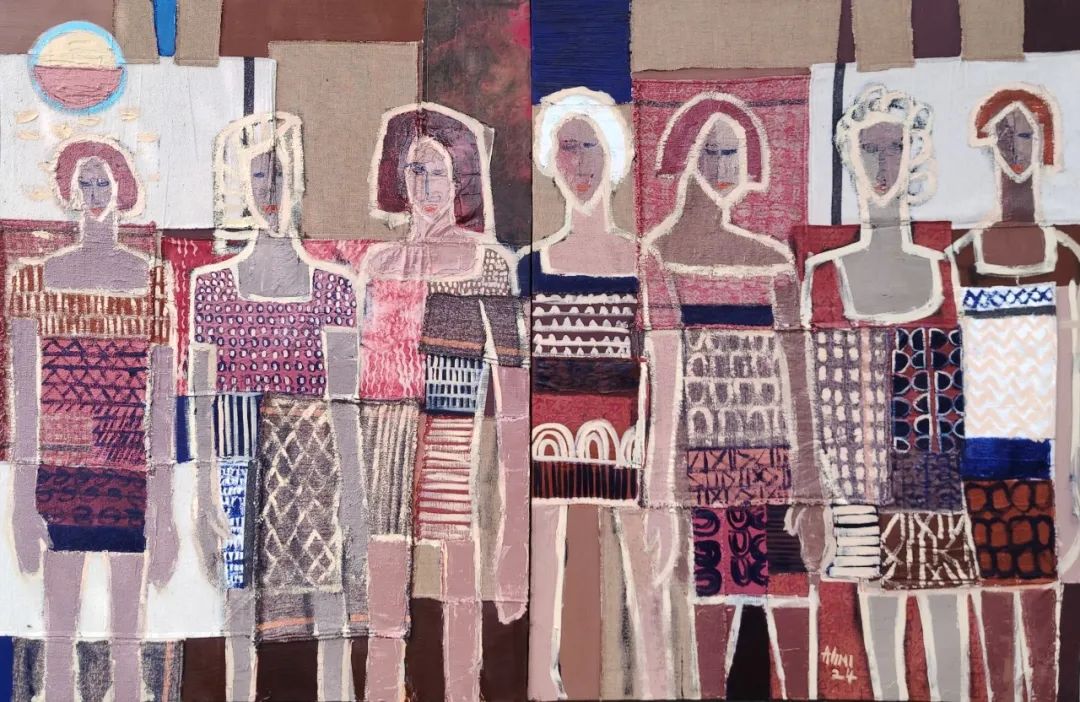 尼⽇利亚艺术家阿丽⽶·阿德⽡勒展开了⼀段创意之旅,围绕着揭⽰定义⾮洲体验的深刻之美和⽂化织锦。此次展出的是他最新的双联画作品《地球姐妹:⽂化的挂毯》,作品创造了⼀种超越界限和语⾔的象征性联系。这些姐妹展现出团结的精神,以及她们相遇、相敬的光辉。艺术家⿎励观者思考多样性,以及⽂化交流对于培育⼀个更具同情⼼和理解的世界的重要性。作品提醒我们有共同责任去培育和保护我们的地球,承认我们都是同⼀个全球⼤家庭中相互联系的成员。