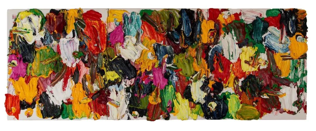 > 朱⾦⽯ b. 1954, 中国, 《⻄⼭的云落⼊⾵景》, 2024, 布面油画, 三聯画, 每幅 180 x 160 cm朱⾦⽯是中国抽象艺术和装置艺术的先驱。尽管作品抽象,却扎根于隐喻之中。他将瞬息万变且内在的经验融⼊惰性物质之中,通过想像⼒和深刻的表达,找到了⼀种富有表现⼒的等效形式。展出的作品包括朱⾦⽯标志性的抽象厚涂画。《卡夫卡的梦都》是厚画进⼊2020年代极具个性的双联作品,代表回到厚笔触绘画的全新阶段。以往的绘画⼯具完全放弃,⽽是以五公分⿊⾊⻓柄画笔为基础,由它们带动画⾯产⽣出⼯作过程中的爆发⼒。这件作品⾊彩浓重似⻛雷⼤作,笔⼒雄劲有千⽄顶⿍之势。此作品⾮系列作品,只有唯⼀。