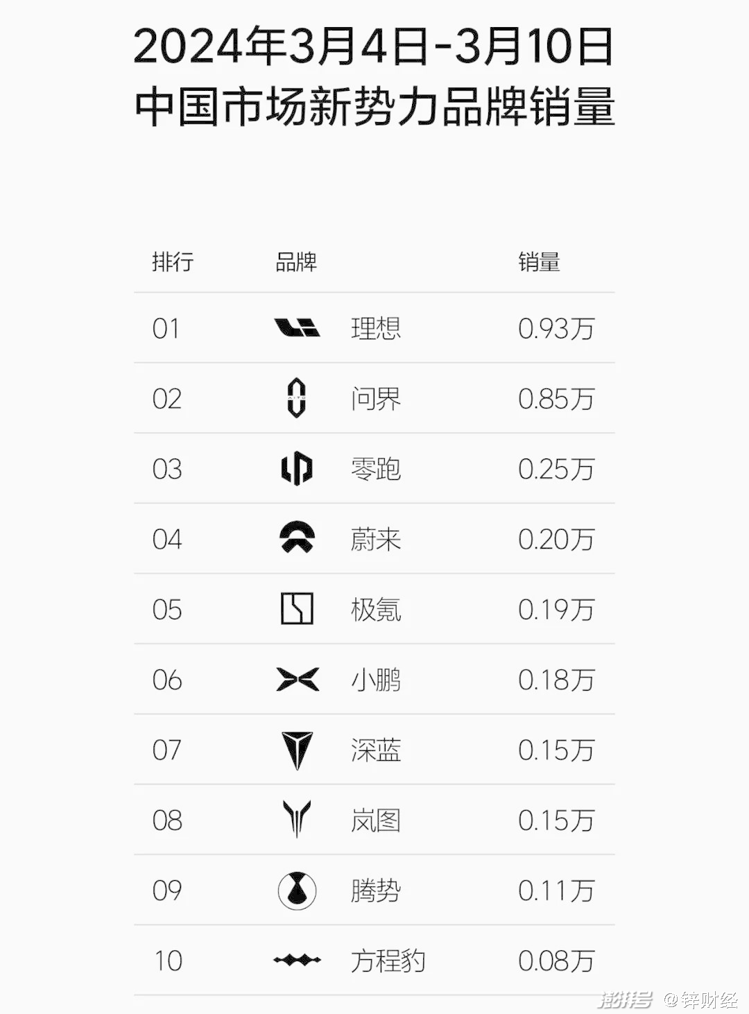 更糟糕的是,从理想汽车公布的3月1日到3月10日的销量榜单数据来看,前十名当中并没有哪吒汽车的身影,而第十名比亚迪子品牌方程豹的销量为0.1万辆。这意味着,3月份前十天哪吒汽车的销量还不足千辆。