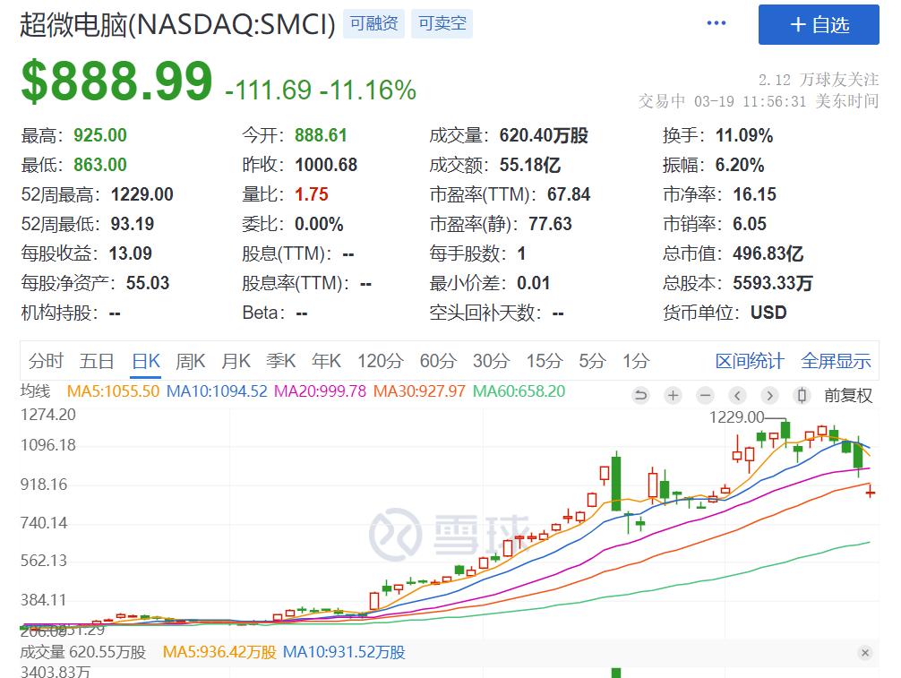 超微电脑暴跌超10%,消息面上,公司表示将以每股900-1000.68美元的价格增发200万股普通股。超微电脑是一家设计和制造高性能服务器的供应商,AI热潮带动了市场对其服务器的强劲需求,该公司股价在一年内涨了12倍,今年迄今累计上涨252%,被市场称为“AI妖股”。