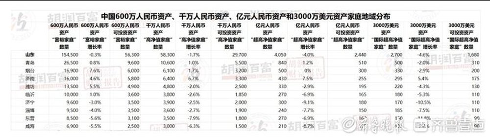 以山东省来说,600万元人民币资产“富裕家庭”为154500户,减少了0.3%;千万元人民币资产“高净值家庭”58300户;亿元人民币资产“超高净值家庭”4050户。